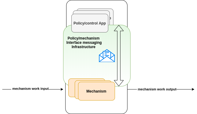 Figure1 illustrates the separation of concern between the two entities: Policy at the top and mechanism at the bottom. These entities communicate through a defined interface labelled as "Policy/mechanism Interface messaging Infrastructure".