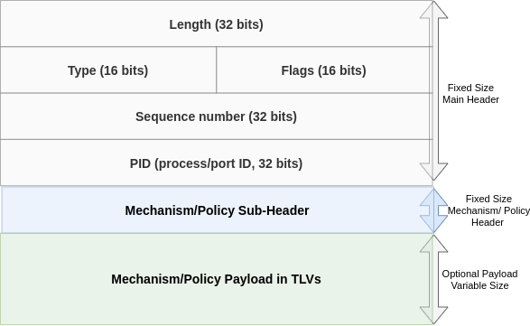 The main header has 5 fields {Length, Type, Flags, Sequence number and PID} that operate on all policy/mechanism exchanges; more discussions on these fields in subsequent text.
