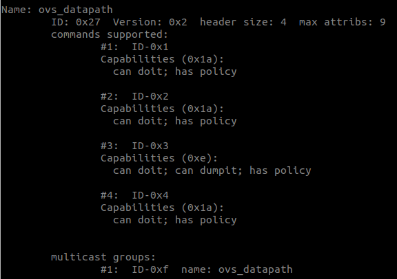 Figure7 shows the features of a Generic Netlink mechanism called ovs_datapath. These features are retrieved when the controller is queried for a mechanism by name (or ID if known). In this case a utility called genl was used (command issued: genl ctrl get name ovs_datapath). The controller's response shows that mechanism ovs_datapath has target address 0x27, has a proprietary sub-header of size 4B, is capable of processing 9 different TLVs and supports 4 commands with IDs 0x1-0x4. Each command definition specifies its functionality/capabilities and the requisite permissions for user-space invocation. Lastly ovs_datapath advertises a single multicast group that can be subscribed to - in this case a multicast group called "ovs_datapath" which has ID/address 0x1.