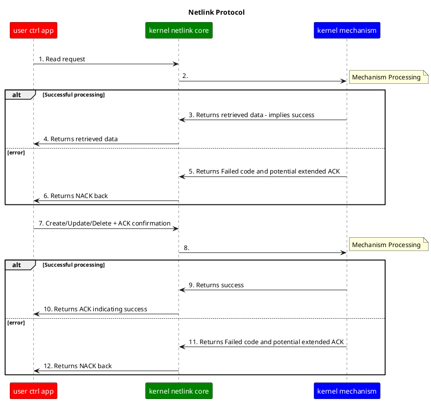 Upon failure in the mechanism processing, the control app will get back a NACK described in section "Netlink Error Reporting".
