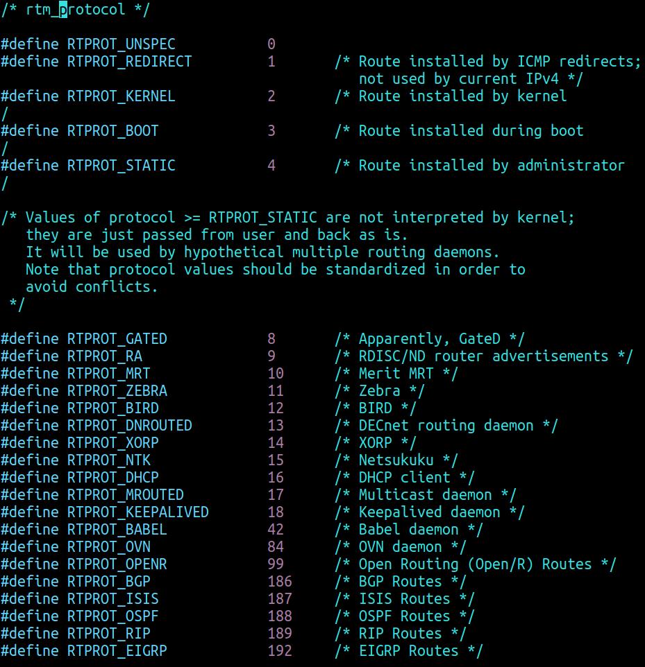 The rtm_protocol field in the routing mechanism sub-header (See Figure3) is used to identify the entity that installed the route; some examples of reserved IDs include RTPROT_ZEBRA which identifies the FRR routing daemon[22], RTPROT_BIRD which identifies the bird[23] routing daemon etc.