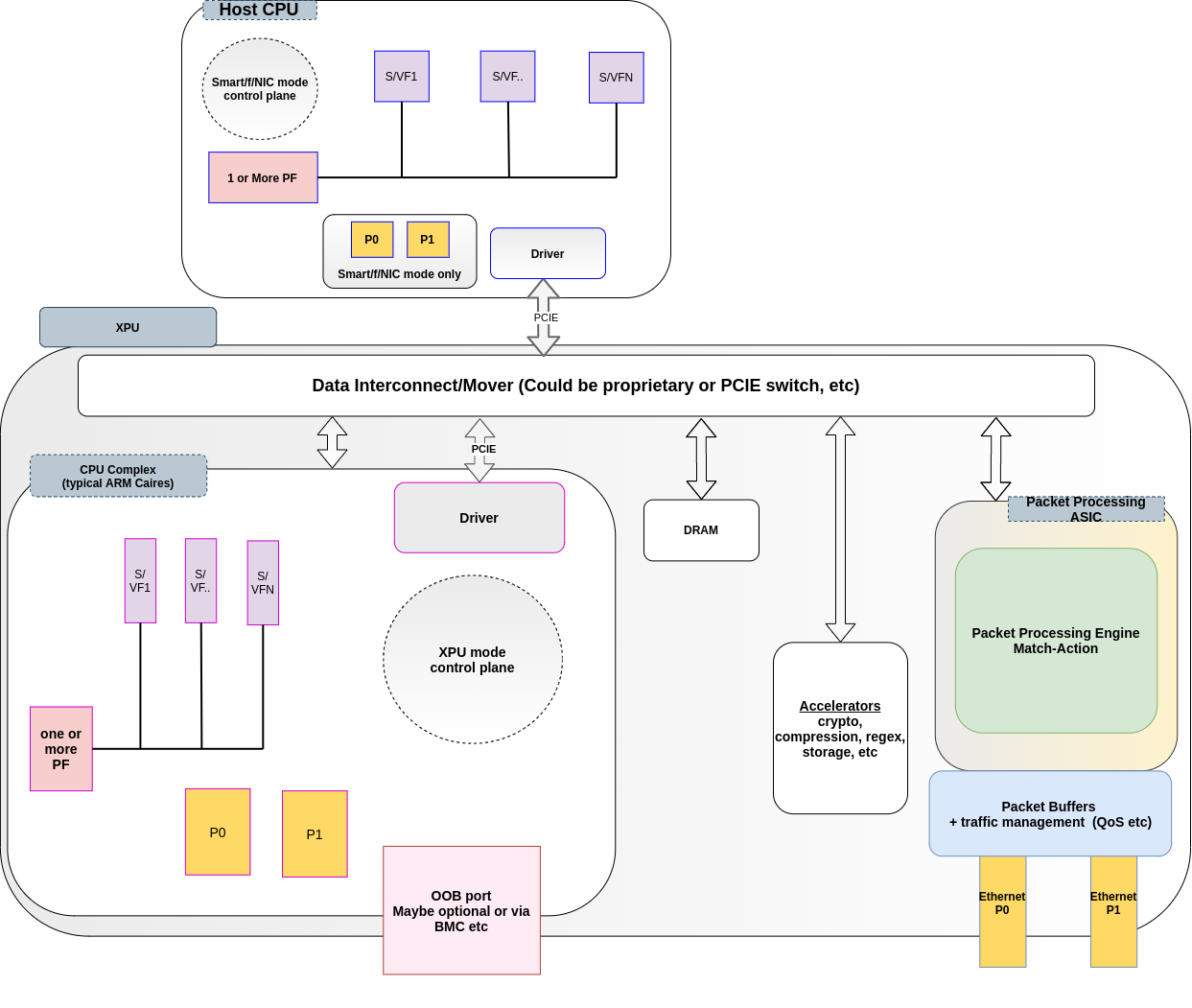 In SmartNIC mode the physical (network) and vports are all exposed on the host side. The control plane is going to need access to the PF on the host for control. In XPU mode the vports are exposed to both the host as well as cpu complex side but the physical (network) ports(where the cables are connected) are only visible on the cpu complex. The control plane is going to need access to the PF on the ARM cpu complex for control.