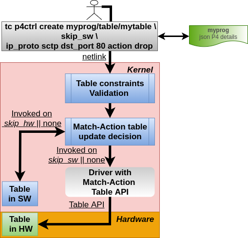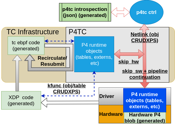The P4TC software datapath uses eBPF accessing P4 objects that require control interface residing in the P4TC domain. In the tradition of TC offloads, both the hardware and software use the same control path interfaces, semantics and tooling.