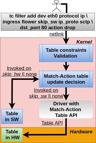 Observe that the match entry abstraction exists both in hardware and in the kernel; the user gets to select whether to install an entry in the kernel, hardware or both. In the illustrated example, the entry skips the software table (keyword skip_sw) and is installed only in the hardware table. To install the entry only in the kernel/software table the keyword skip_hw is used. When neither skip_sw or skip_hw is specified the kernel attempts to install the entry both in s/w and h/w (it may fail on the hardware side if there are no more resources available to accommodate the table entry).
